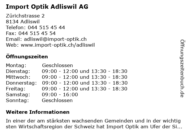 | Öffnungszeiten Import Optik Adliswil AG in Adliswil anzeigen | |