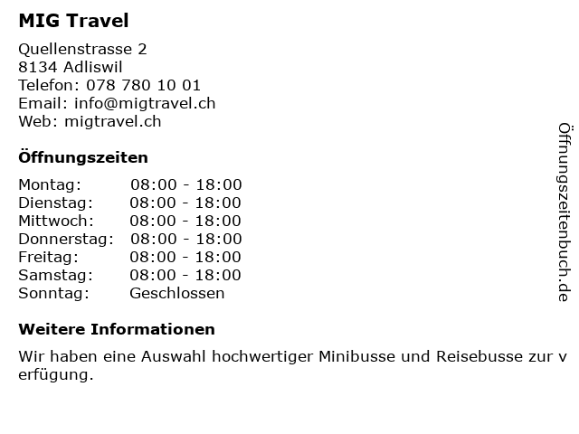 | Öffnungszeiten MIG Travel in Adliswil anzeigen | |