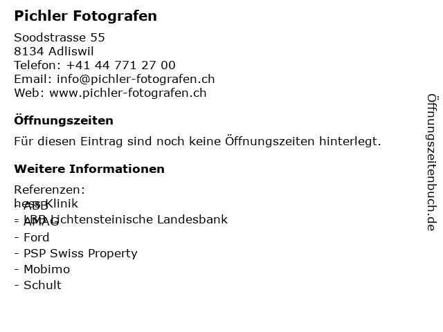 | Öffnungszeiten Pichler Fotografen in Adliswil anzeigen | |