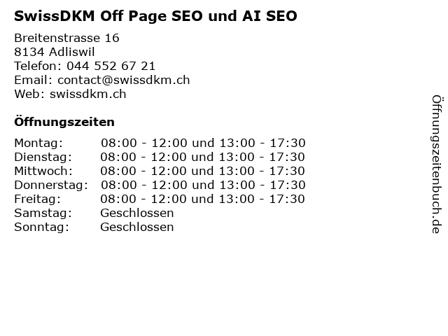 Öffnungszeiten                            SwissDKM Off Page SEO und AI SEO