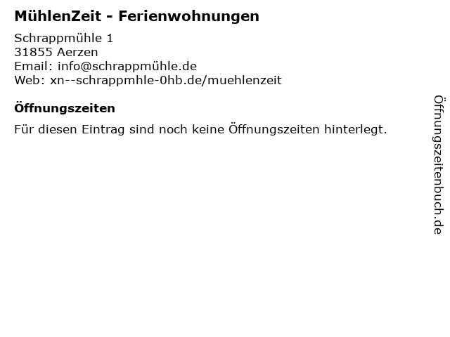 | Öffnungszeiten MühlenZeit - Ferienwohnungen in Aerzen anzeigen | |
