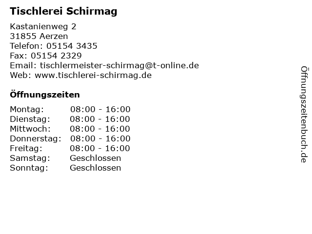 | Öffnungszeiten Tischlerei Schirmag in Aerzen anzeigen | |