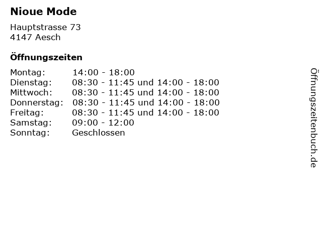 | Öffnungszeiten Nioue Mode in Aesch anzeigen | |