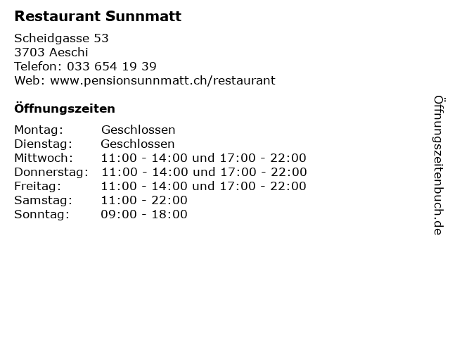| Öffnungszeiten Restaurant Sunnmatt in Aeschi anzeigen | |