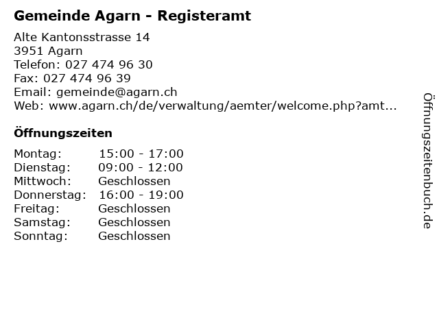 | Öffnungszeiten Gemeinde Agarn - Registeramt in Agarn anzeigen | |