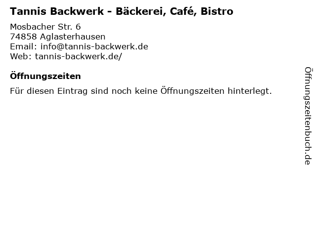 | Öffnungszeiten Tannis Backwerk - Bäckerei, Café, Bistro in Aglasterhausen anzeigen | |