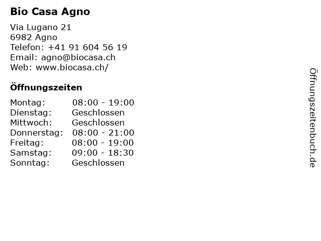 | Öffnungszeiten Bio Casa Agno in Agno anzeigen | |