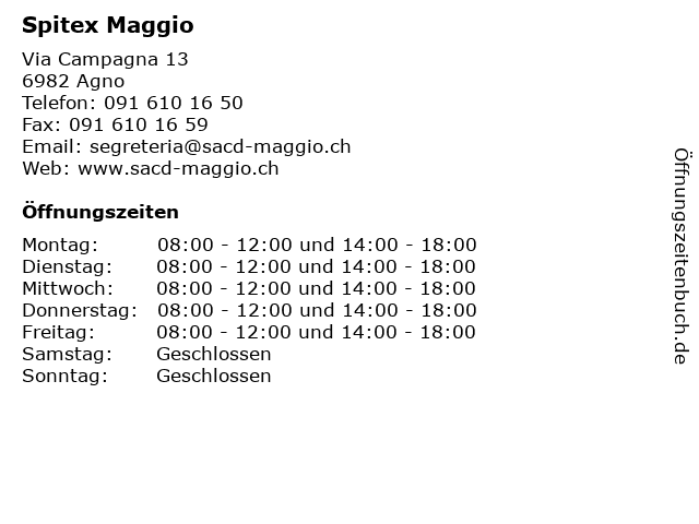 | Öffnungszeiten Spitex Maggio in Agno anzeigen | |