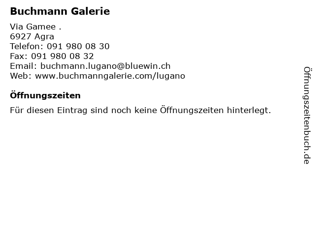 | Öffnungszeiten Buchmann Galerie in Agra anzeigen | |