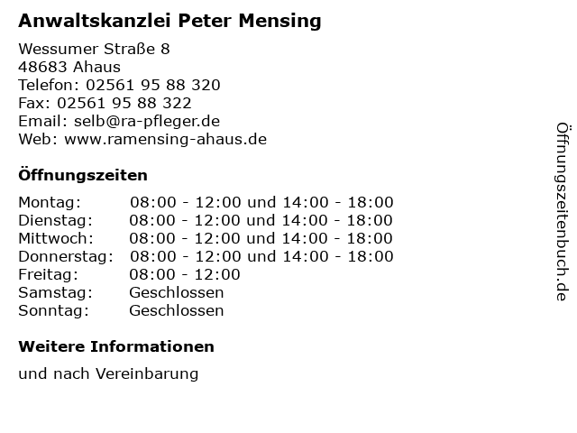 | Öffnungszeiten Anwaltskanzlei Peter Mensing in Ahaus anzeigen | |