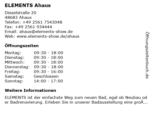 | Öffnungszeiten ELEMENTS Ahaus in Ahaus anzeigen | |