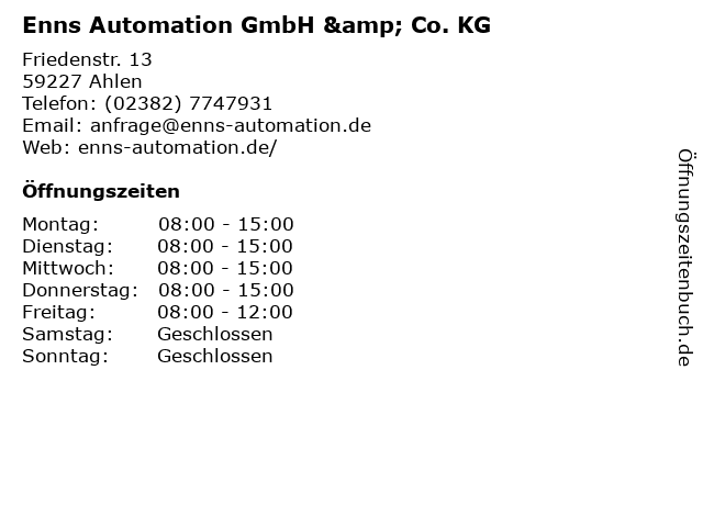 | Öffnungszeiten Enns Automation GmbH & Co. KG in Ahlen anzeigen | |