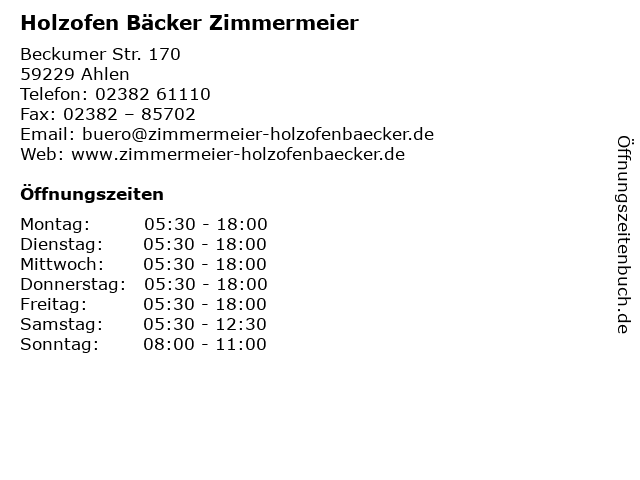 | Öffnungszeiten Holzofen Bäcker Zimmermeier in Ahlen anzeigen | |