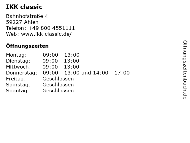 | Öffnungszeiten IKK classic in Ahlen anzeigen | |