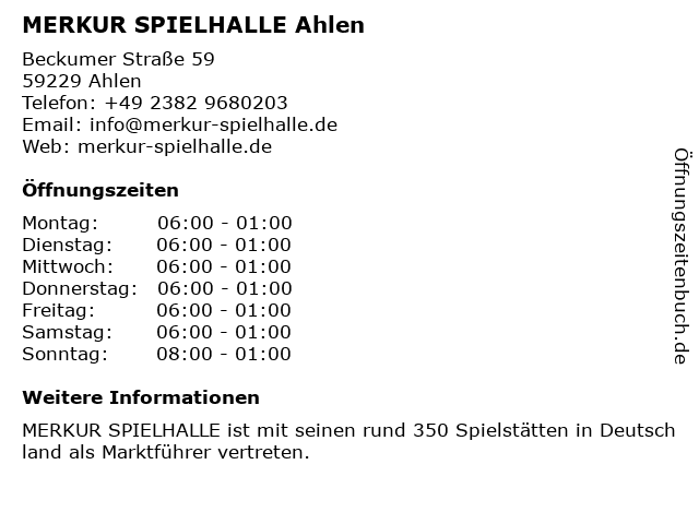 | Öffnungszeiten MERKUR SPIELHALLE Ahlen in Ahlen anzeigen | |