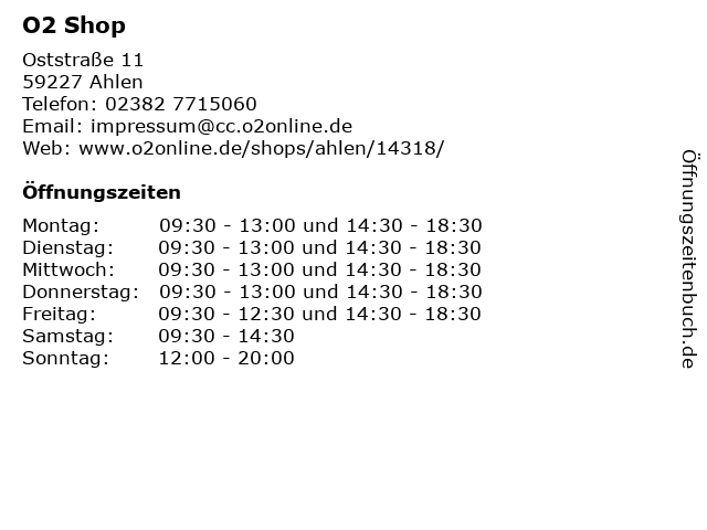 | Öffnungszeiten O2 Shop in Ahlen anzeigen | |