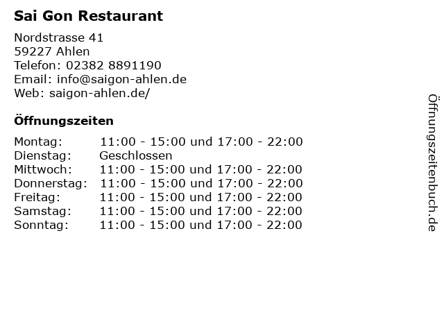 | Öffnungszeiten Sai Gon Restaurant in Ahlen anzeigen | |