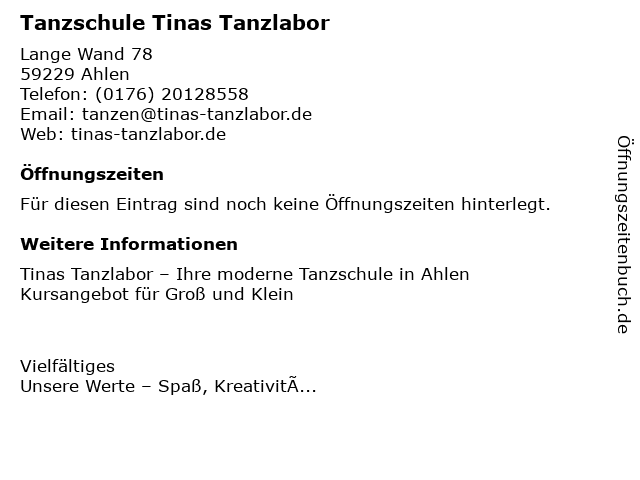 | Öffnungszeiten Tanzschule Tinas Tanzlabor in Ahlen anzeigen | |