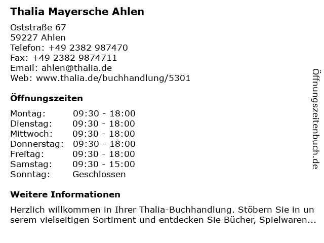 | Öffnungszeiten Thalia Mayersche Ahlen in Ahlen anzeigen | |