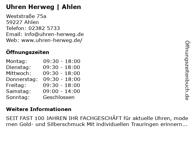 | Öffnungszeiten Uhren Herweg | Ahlen in Ahlen anzeigen | |