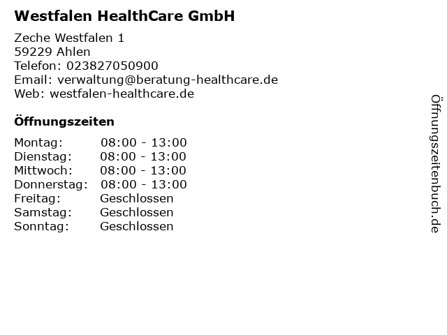 | Öffnungszeiten Westfalen HealthCare GmbH in Ahlen anzeigen | |