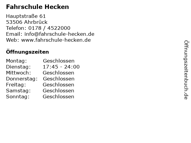 | Öffnungszeiten Fahrschule Hecken in Ahrbrück anzeigen | |