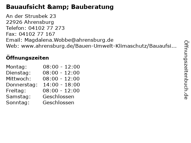 | Öffnungszeiten Bauaufsicht & Bauberatung in Ahrensburg anzeigen | |