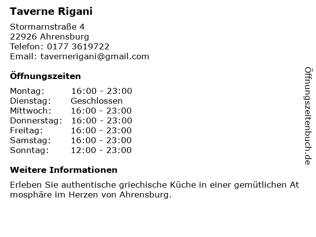 | Öffnungszeiten Taverne Rigani in Ahrensburg anzeigen | |