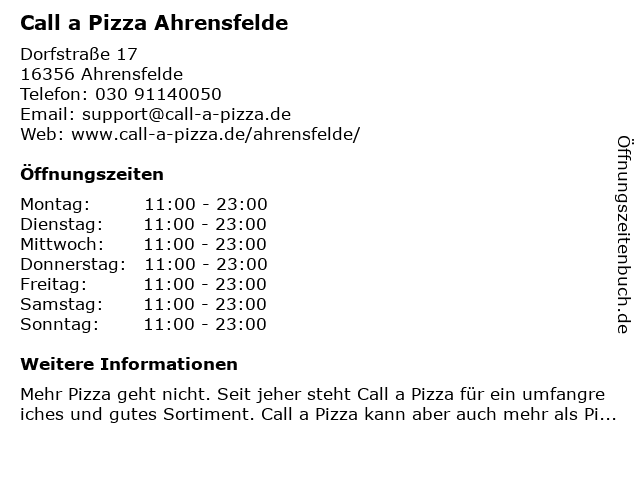 | Öffnungszeiten Call a Pizza Ahrensfelde in Ahrensfelde anzeigen | |