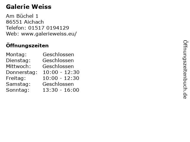 | Öffnungszeiten Galerie Weiss in Aichach anzeigen | |