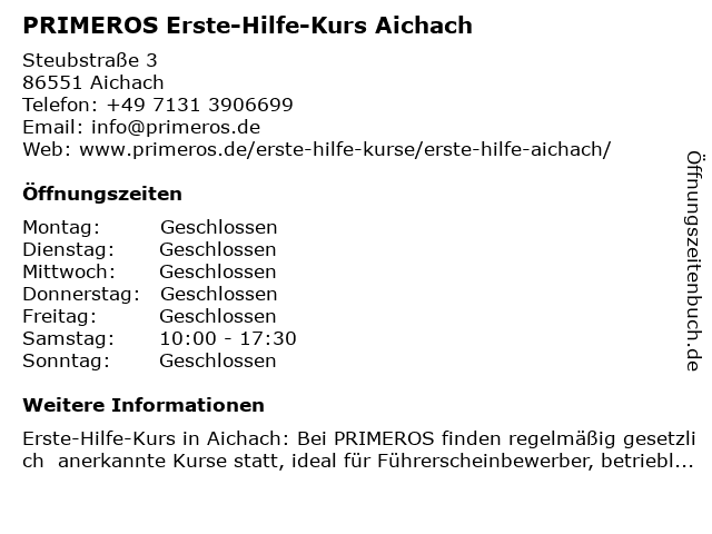 Branchen & Suchbegriffe zu PRIMEROS Erste-Hilfe-Kurs Aichach:erste, erste hilfe am unfallort, erste hilfe kurs, erste-hilfe, erste-hilfe-kurs, führerschein sehtest, herz-lungen-wiederbelebung, herzinfarkt, hilfe, kurs, primeros, schlaganfall, stabile seitenlage, verbandmaterial, weiterbildung |