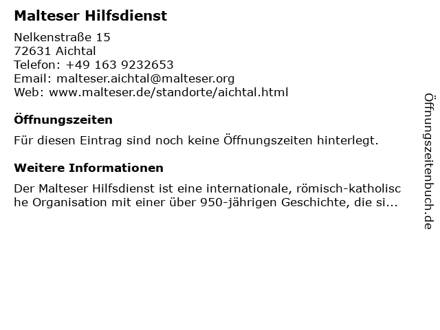 | Öffnungszeiten Malteser Hilfsdienst in Aichtal anzeigen | |