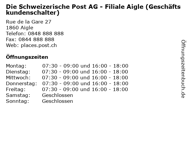Branchen & Suchbegriffe zu Die Schweizerische Post AG - Filiale Aigle (Geschäftskundenschalter):aigle, geschäftskunden, geschäftskundenschalter, pakete, post, päckchen, schalter, schweizerische, versand |