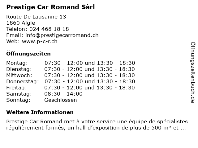 | Öffnungszeiten Prestige Car Romand Sàrl in Aigle anzeigen | |