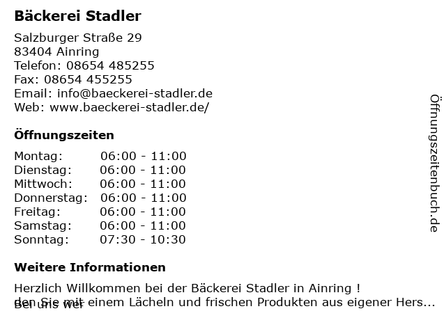 | Öffnungszeiten Bäckerei Stadler in Ainring anzeigen | |