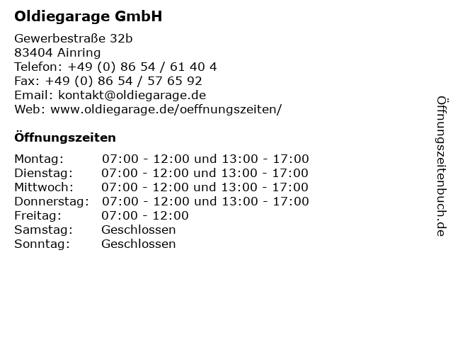 | Öffnungszeiten Oldiegarage GmbH in Ainring anzeigen | |