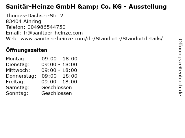 2 Sanitär-Heinze GmbH & Co. KG - Abholverkauf (Entfernung: 0,05 km) Thomas-Dachser-Str. 2, 83404 Ainring 5 Sanitär-Heinze Handelsges. m. b. H. (Büro) (Entfernung: 3,20 km) Franz-Sauer-Strasse 40, 5020 Salzburg 6 |