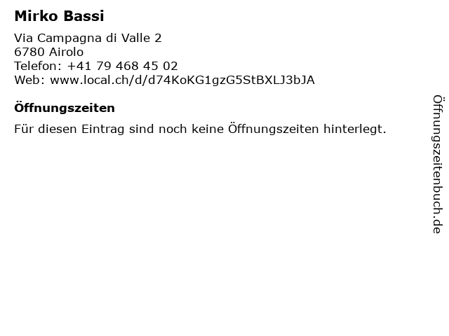| Öffnungszeiten Mirko Bassi in Airolo anzeigen | |