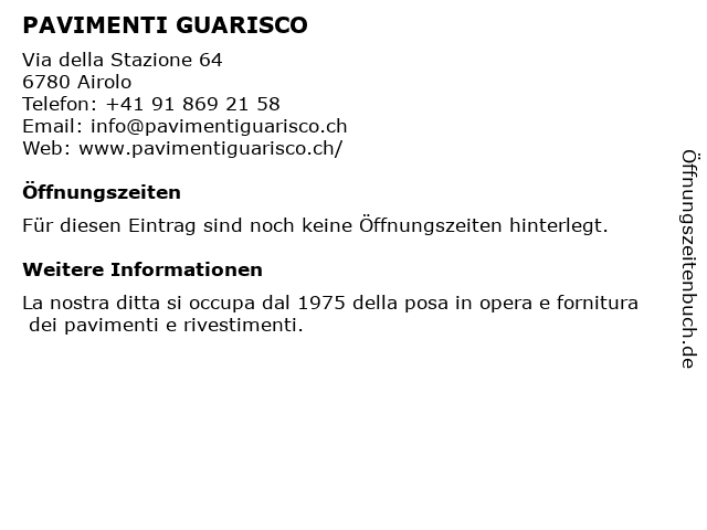 | Öffnungszeiten PAVIMENTI GUARISCO in Airolo anzeigen | |