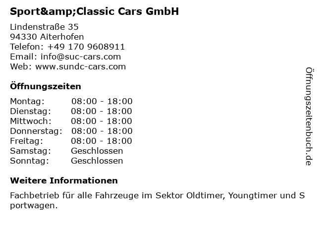 | Öffnungszeiten Sport&Classic Cars GmbH in Aiterhofen anzeigen | |