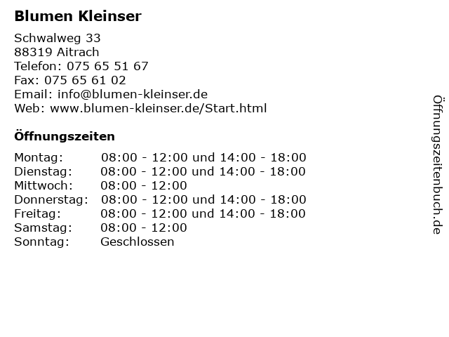 | Öffnungszeiten Blumen Kleinser in Aitrach anzeigen | |