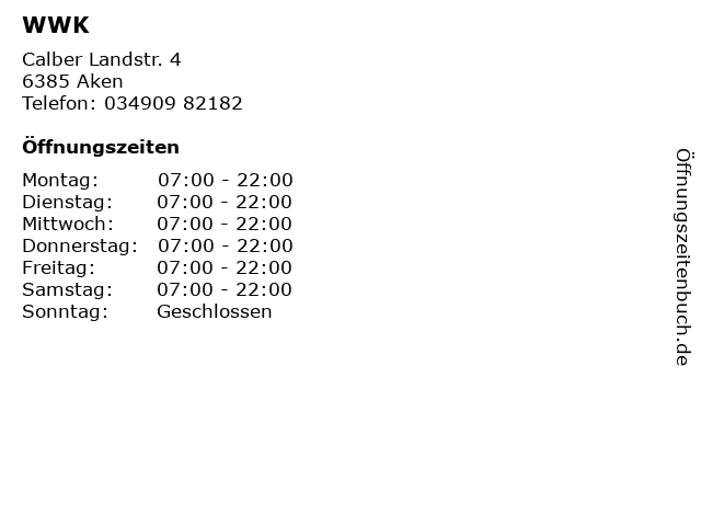 | Öffnungszeiten WWK in Aken anzeigen | |