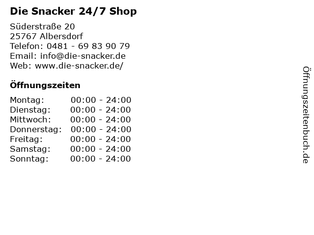 | Öffnungszeiten Die Snacker 24/7 Shop in Albersdorf anzeigen | |