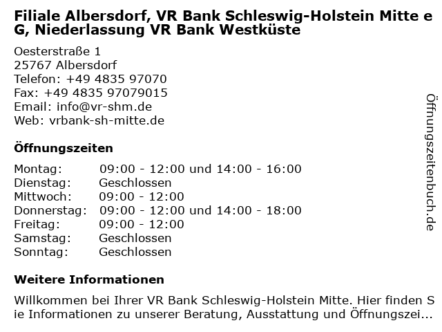 Branchen & Suchbegriffe zu Filiale Albersdorf, VR Bank Schleswig-Holstein Mitte eG, Niederlassung VR Bank Westküste:albersdorf, bank, eg, holstein, mitte, niederlassung, vr, westküste |