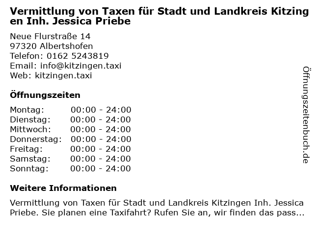 Branchen & Suchbegriffe zu Vermittlung von Taxen für Stadt und Landkreis Kitzingen Inh. Jessica Priebe:jessica, landkreis, limousinenservice, priebe, stadt, taxen, transportunternehmen, vermittlung, von |