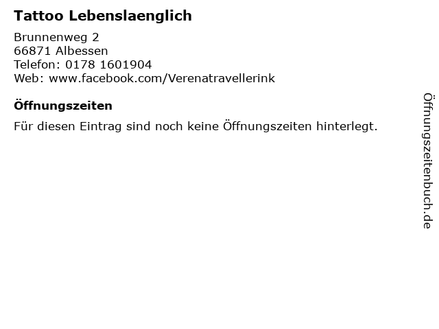 | Öffnungszeiten Tattoo Lebenslaenglich in Albessen anzeigen | |