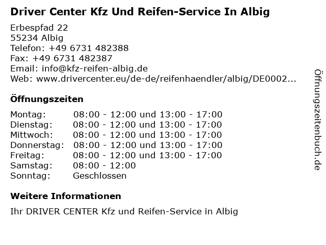 Branchen & Suchbegriffe zu Driver Center Kfz Und Reifen-Service In Albig:achsenvermessung, albig, autobatterieservice, bremsenservice, center, driver, inspektion-wartung, kfz, kfz-service, lichttest, reifen, reifen kaufen, reifenhändler, reifenreparatur, service, ölwechsel |