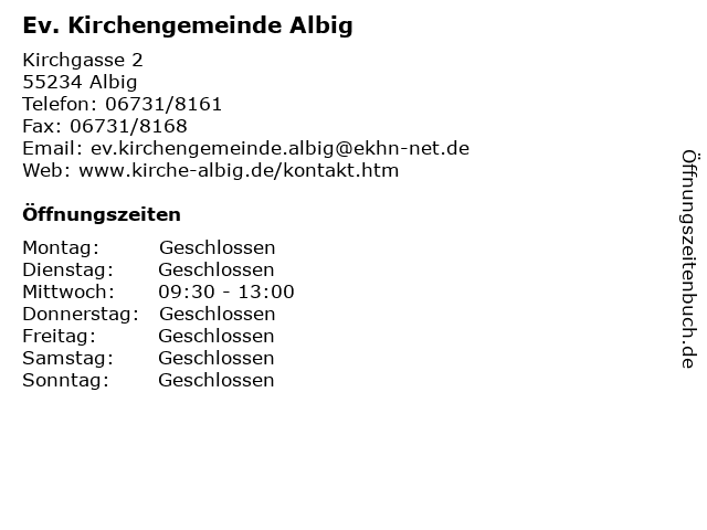 | Öffnungszeiten Ev. Kirchengemeinde Albig in Albig anzeigen | |