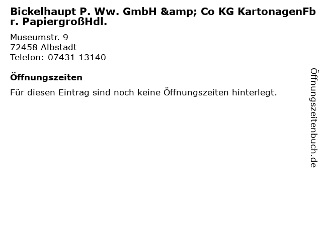 | Bickelhaupt P. Ww. GmbH & Co KG KartonagenFbr. PapiergroßHdl. anrufen | |