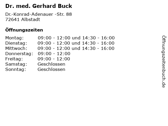 | Öffnungszeiten Dr. med. Gerhard Buck in Albstadt anzeigen | |